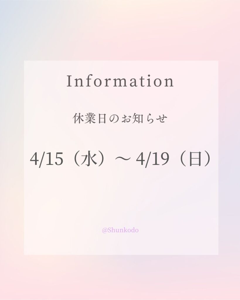 🌟休業日のおしらせ:4/15~19🌟 お知らせ 2026.04.14 休業日のお知らせをいたします 誠に勝手ながら、2026年4月15日(水)~2026年4月19日(日)の期間 休業させていただきます 2026年4月20日(月)より通常営業いたします 休業期間中にいただきました各種お問い合わせ、ご相談につきましては 2026年4月20日(月)15時以降より順次回答させていただきます ご不便をおかけしますが何卒よろしくお願い申し上げます